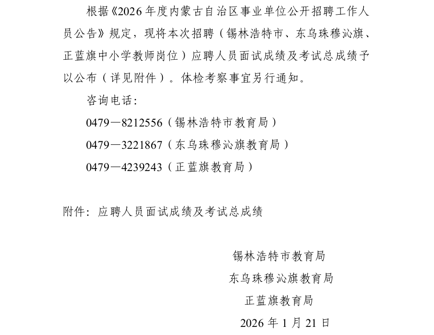 關(guān)于公布2026年度內(nèi)蒙古自治區(qū)事業(yè)單位公開招聘(錫林浩特市、東烏珠穆沁旗、正藍旗中小學(xué)教師崗位)面試成績及考試總成績的公告