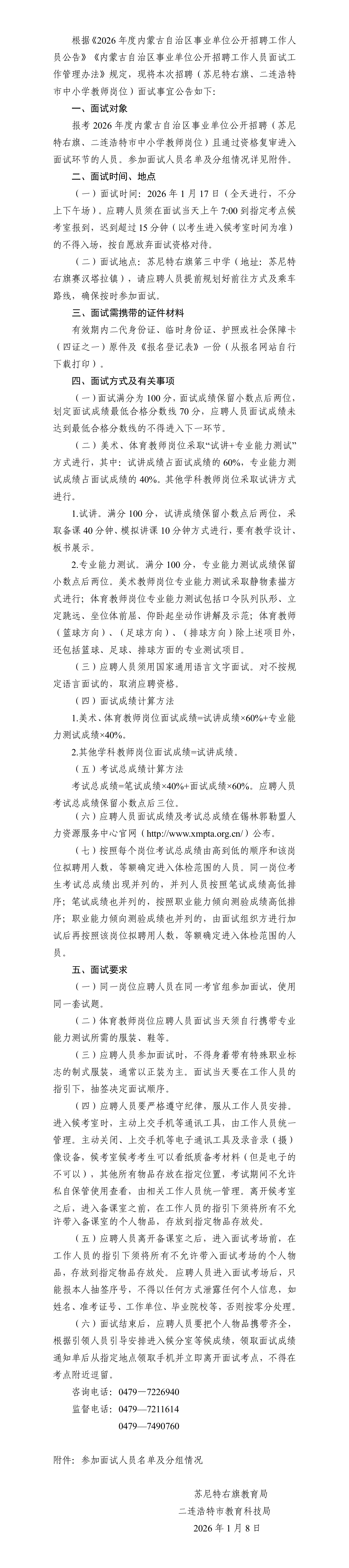 2026年內(nèi)蒙古自治區(qū)事業(yè)單位公開招聘 (蘇尼特右旗、二連浩特市中小學(xué)教師崗位)面試公告