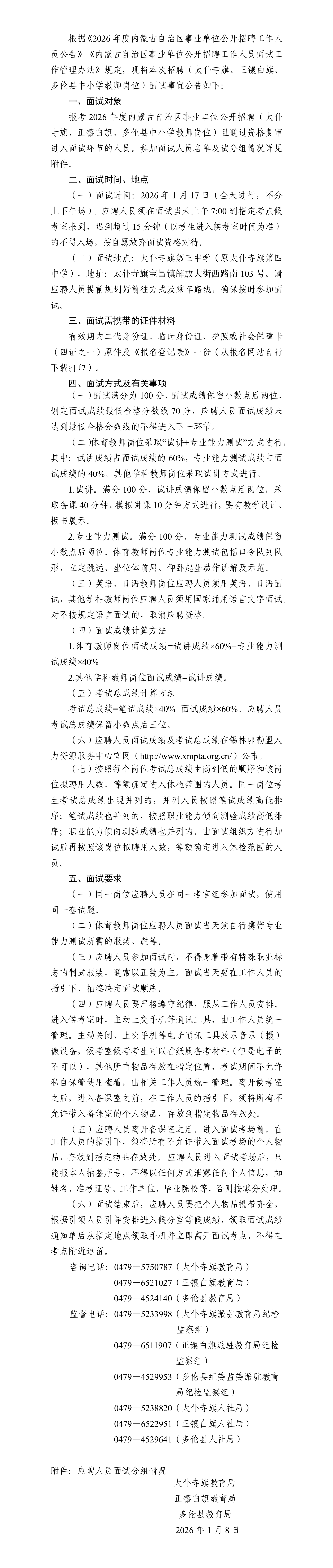 2026年度內(nèi)蒙古自治區(qū)事業(yè)單位公開招聘 (太仆寺旗、正鑲白旗、多倫縣中小學教師崗位) 面試公告
