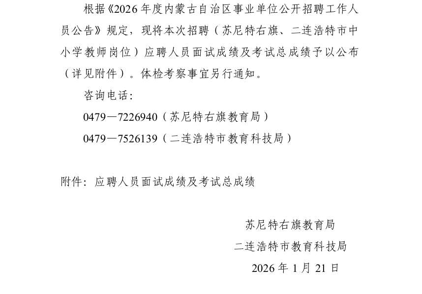 關(guān)于公布2026年度內(nèi)蒙古自治區(qū)事業(yè)單位公開招聘(蘇尼特右旗、二連浩特市中小學(xué)教師崗位)面試成績及考試總成績的公告