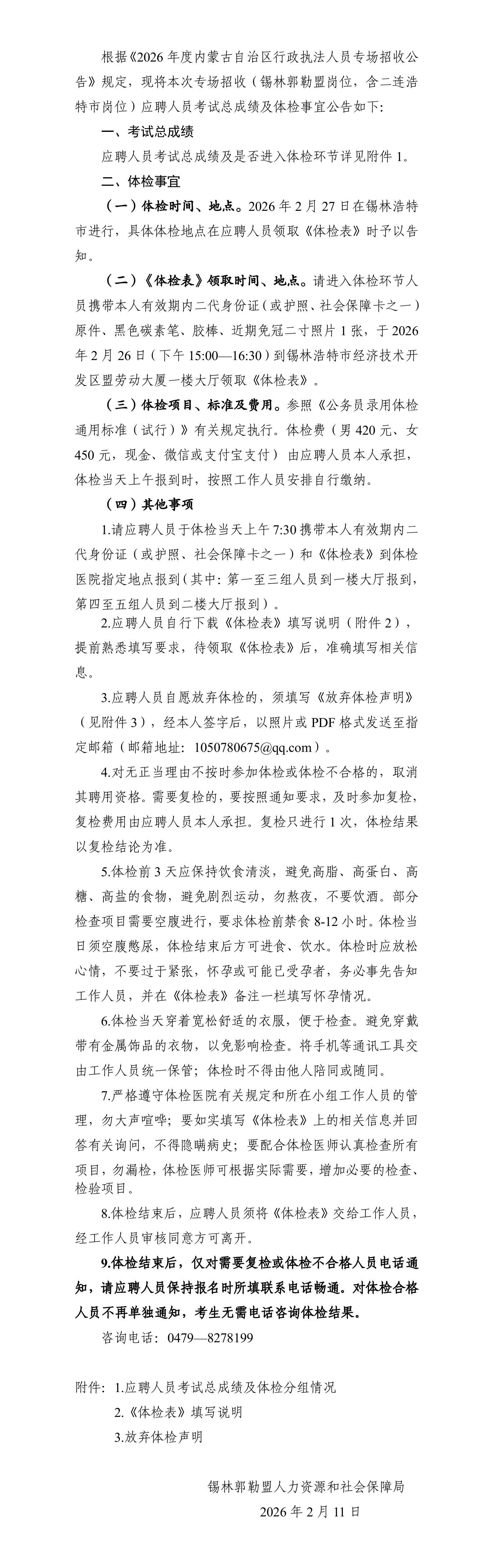 關(guān)于公布2026年度內(nèi)蒙古自治區(qū)行政執(zhí)法人員專場招收(錫林郭勒盟崗位)考試 總成績及體檢事宜公告